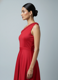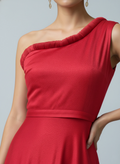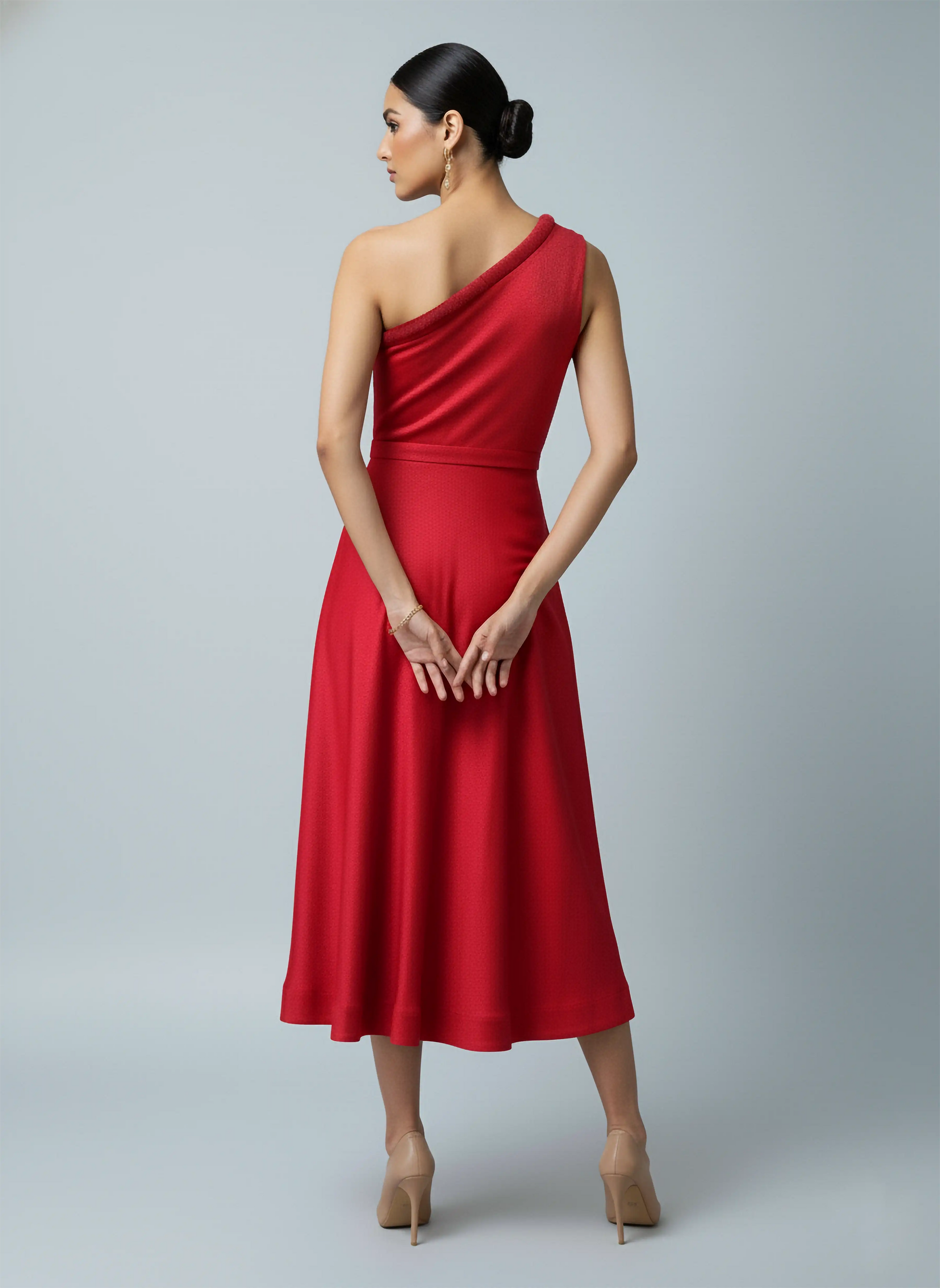 Step into refined elegance with this one-shoulder Agahmi midi dress, crafted from smooth orange peel fabric for a graceful fall. The asymmetric neckline features a textured trim, while the fitted bodice flows into a soft A-line skirt—creating a timeless, flattering silhouette. Finished with a clean waist detail and concealed side zip, it’s perfect for polished evenings or special celebrations.