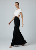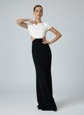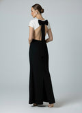 Step into understated elegance with this two-tone Agahmi maxi dress, crafted from high-quality polyester. In soft white and black, it features a boat neckline, short sleeves, and a front-waist join that mimics two pieces while keeping the back open. A detachable black bow adds a playful touch, and the back zip with button closure ensures a seamless fit—perfect for refined occasions or standout evenings.