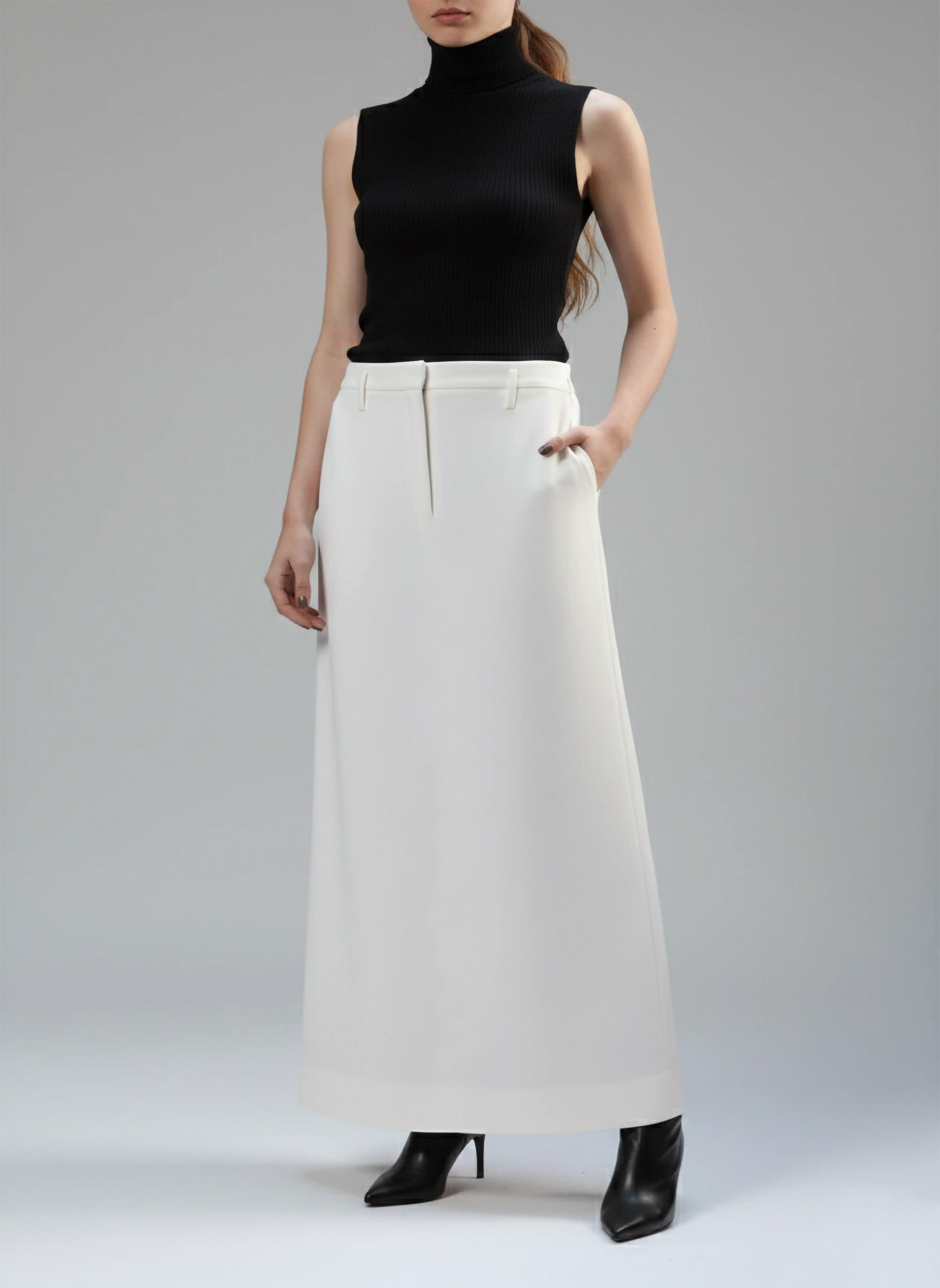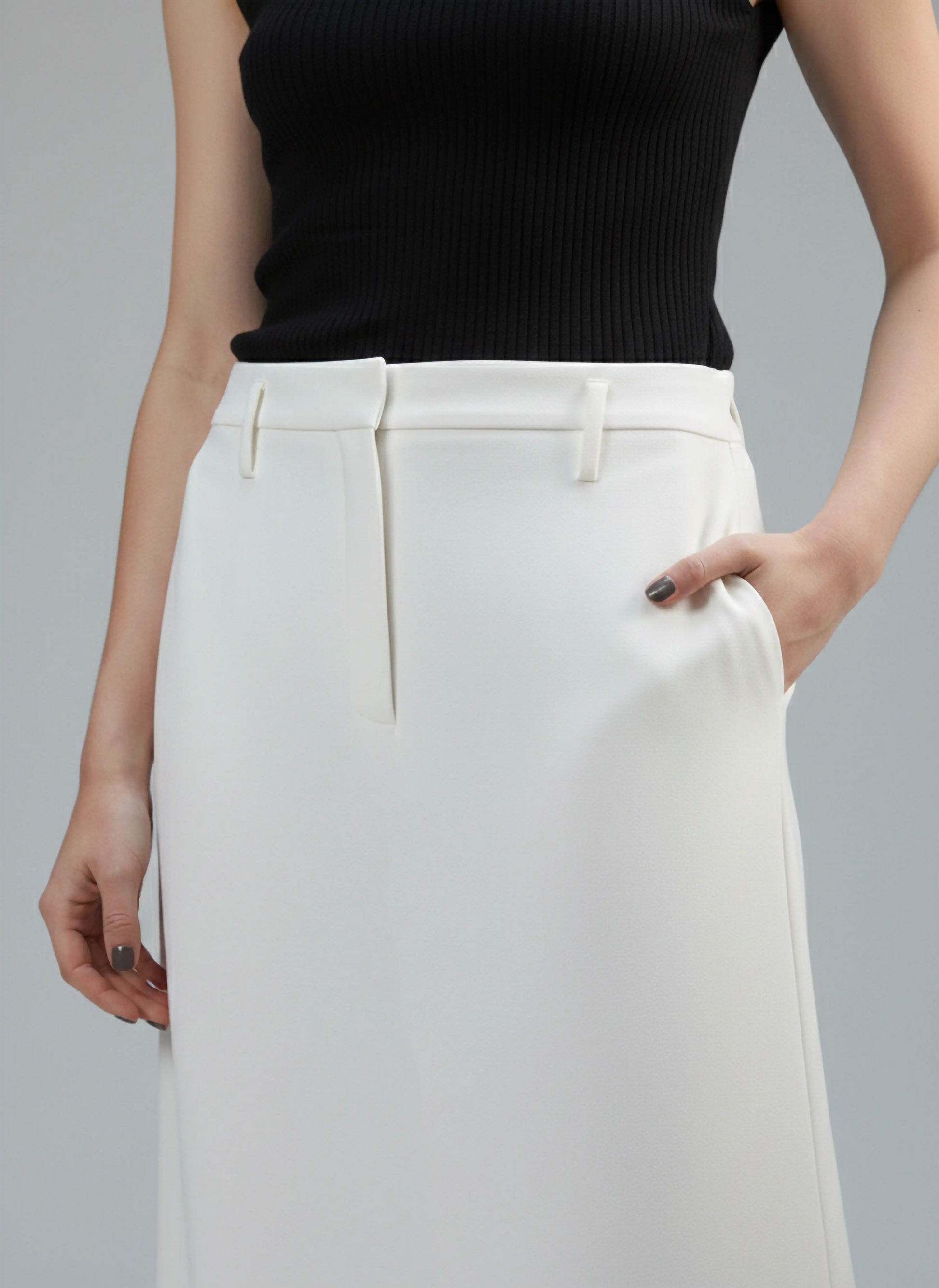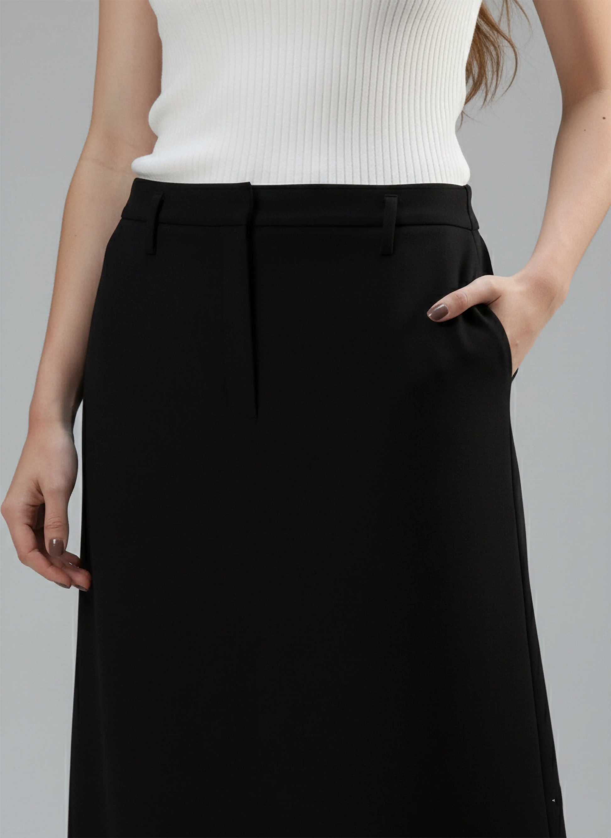 Embrace effortless elegance with this sophisticated no slit maxi skirt from Agahmi. Designed with a flattering high waist, this skirt features a straight fit that drapes beautifully for a sleek silhouette. The belt loops are strategically placed below the waistband, allowing for versatile styling options with your favorite belts. The concealed front button hook and zip fastening provide a polished finish, making this maxi skirt perfect for both casual and formal occasions.