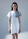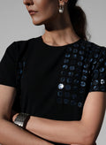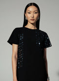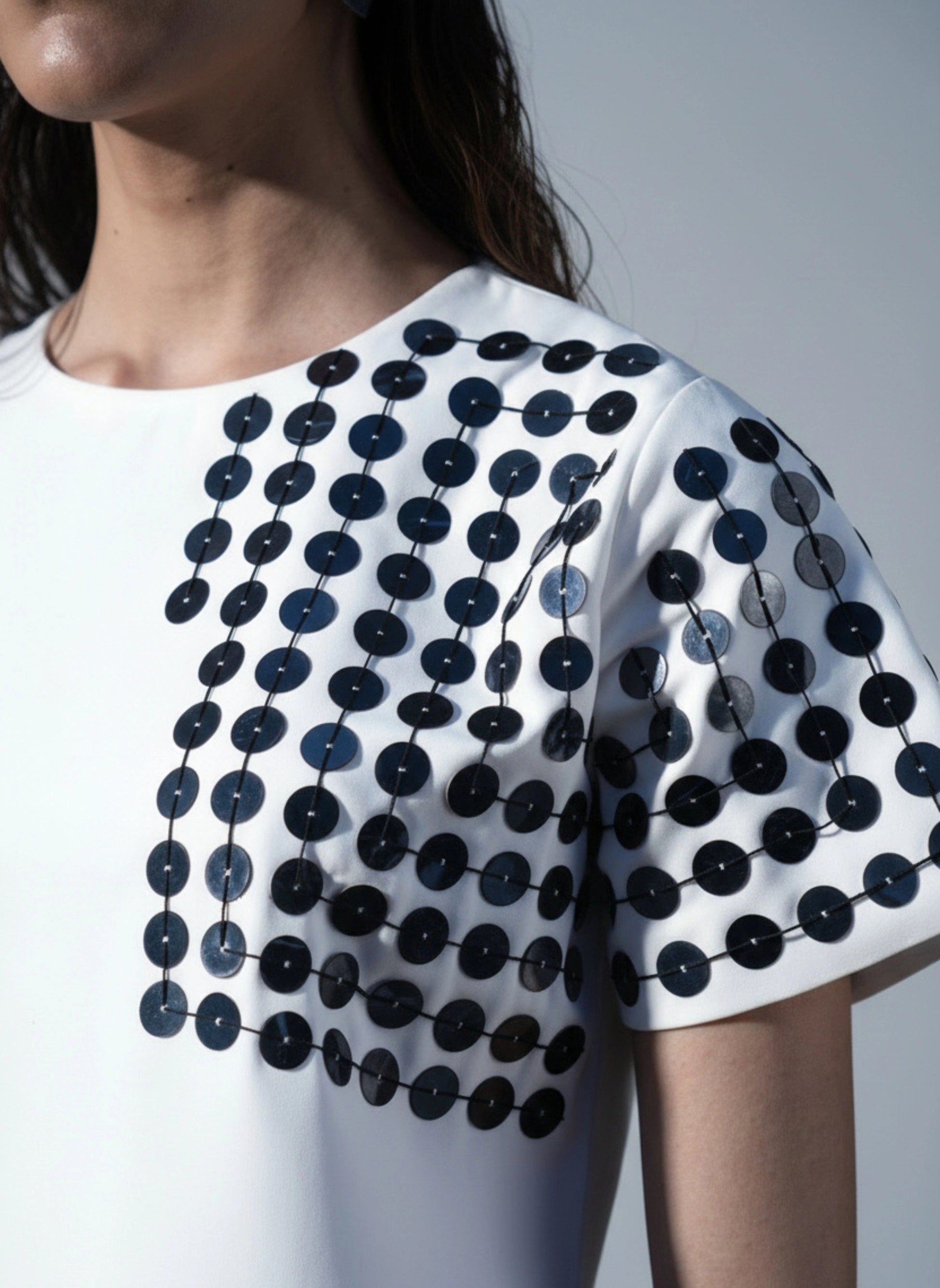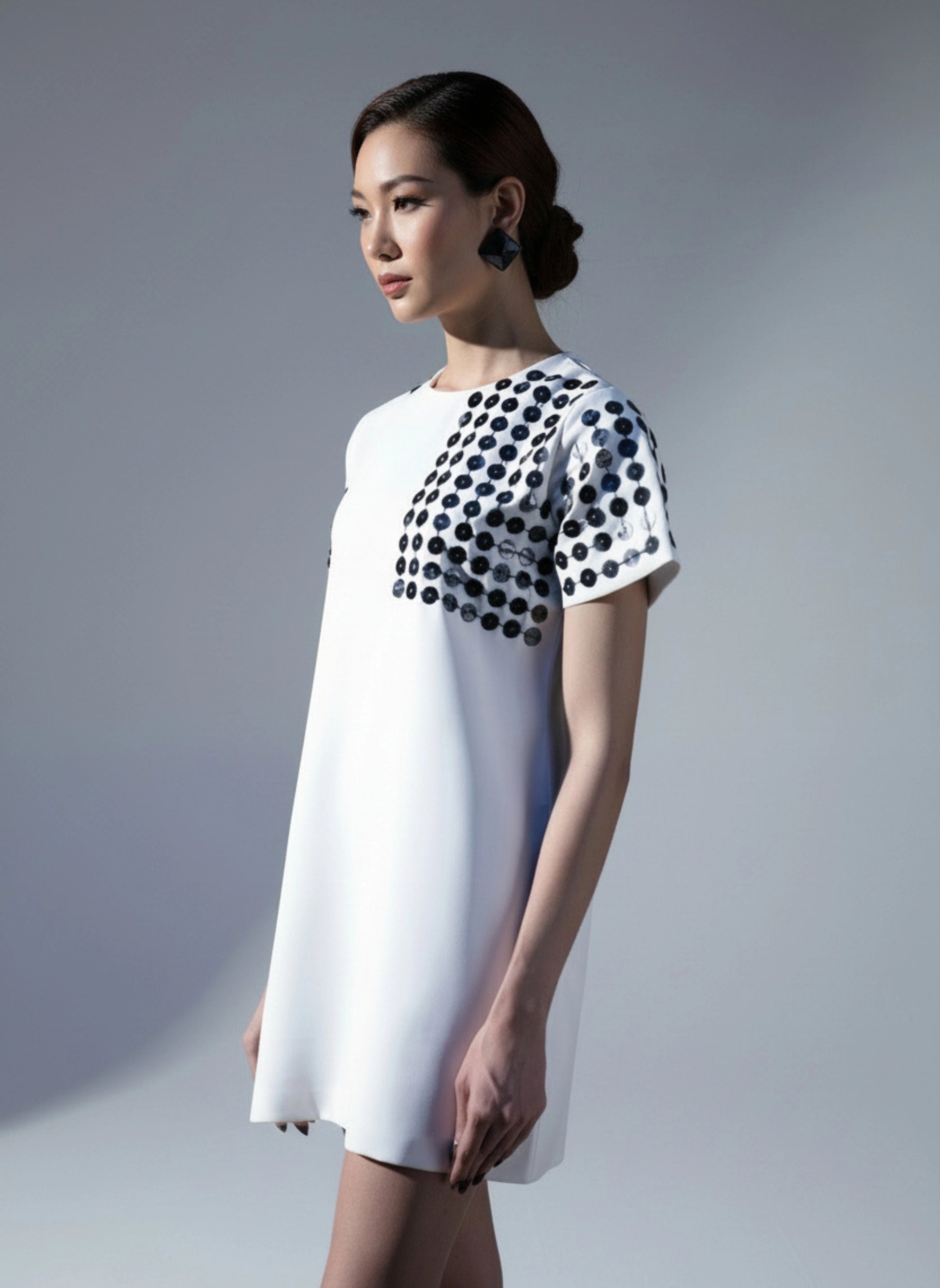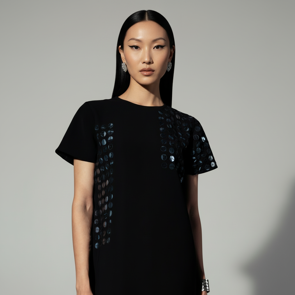 Crafted from high-quality polyester, this dress features a boxy fit and round neck for a sophisticated yet relaxed silhouette. The bold embellishments, made from repurposed X-ray sheets, add a unique, artistic twist to the classic sequin design. The dropped shoulders enhance the dress's modern aesthetic, while the zip at the back ensures a seamless fit. Designed to hit just above the knee, this dress is perfect for making a statement at any occasion. Wear it solo or layer for an effortlessly chic look.