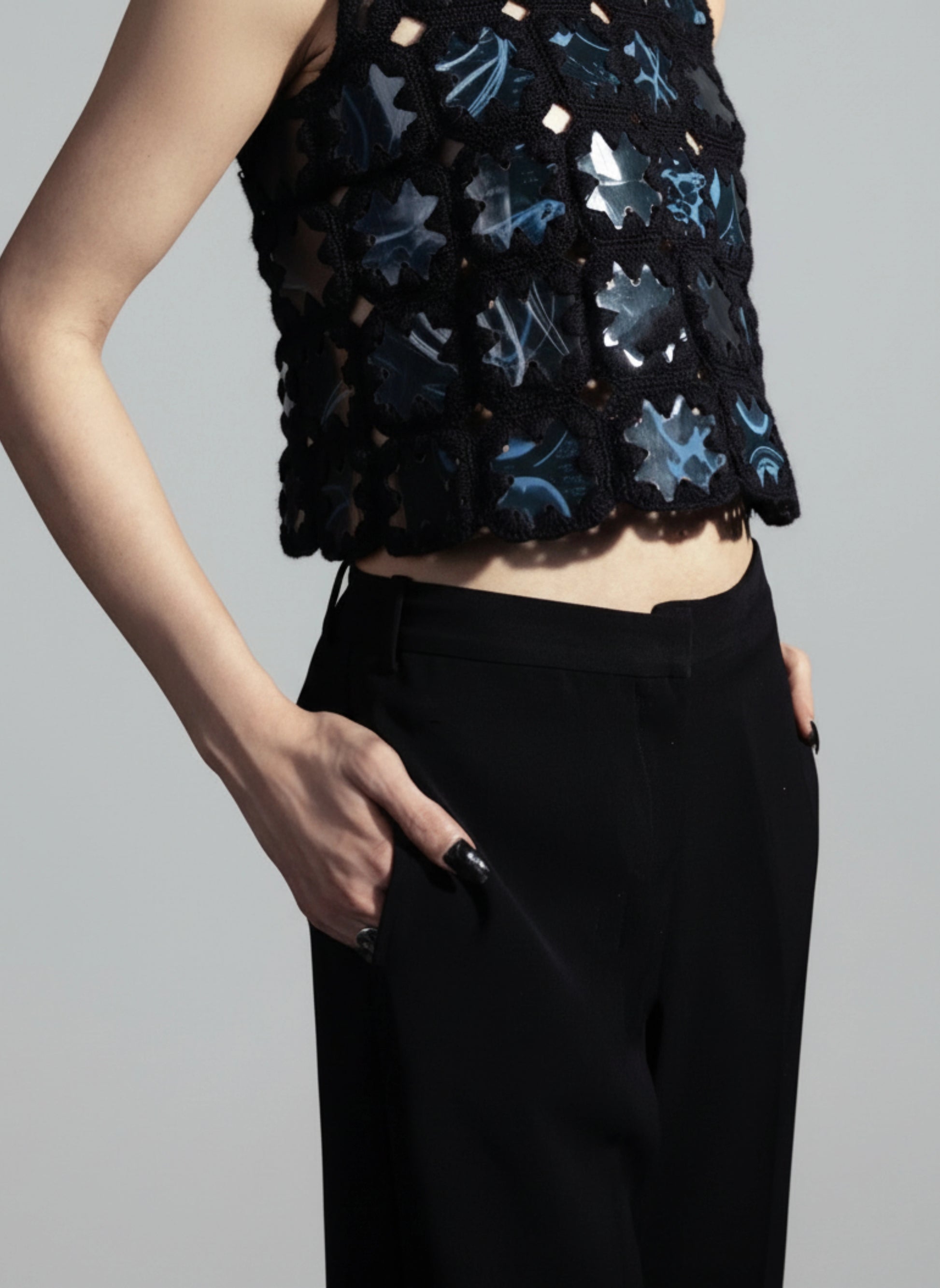 While Agahmi embraces creative upcycling by using waste X-ray sheets in our designs, the rest of our materials, including the polyester base fabric, are not strictly sustainable. Our focus is on avant-garde fashion, where art meets wearability, and we believe in giving unconventional materials a second life.