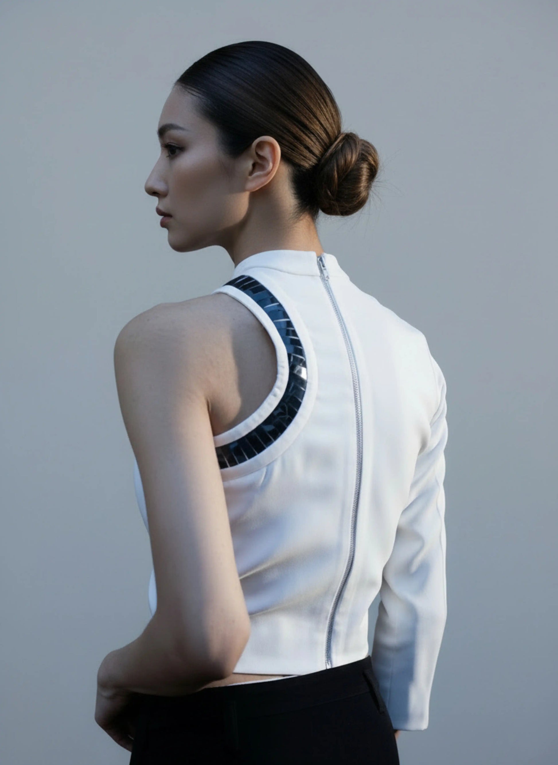 While Agahmi embraces creative upcycling by using waste X-ray sheets in our designs, the rest of our materials, including the polyester base fabric, are not strictly sustainable. Our focus is on avant-garde fashion, where art meets wearability, and we believe in giving unconventional materials a second life.