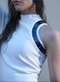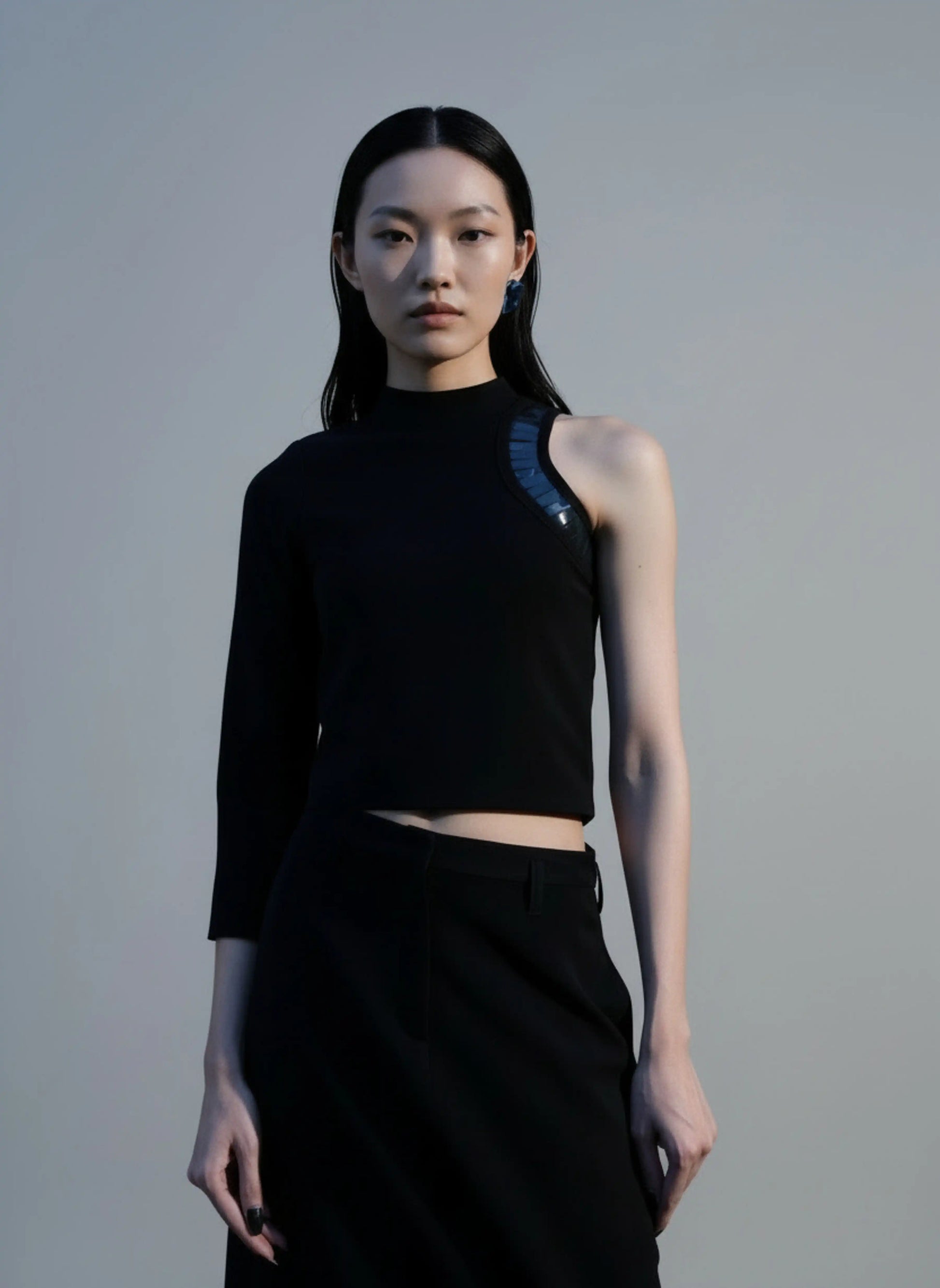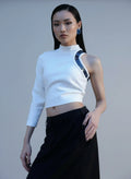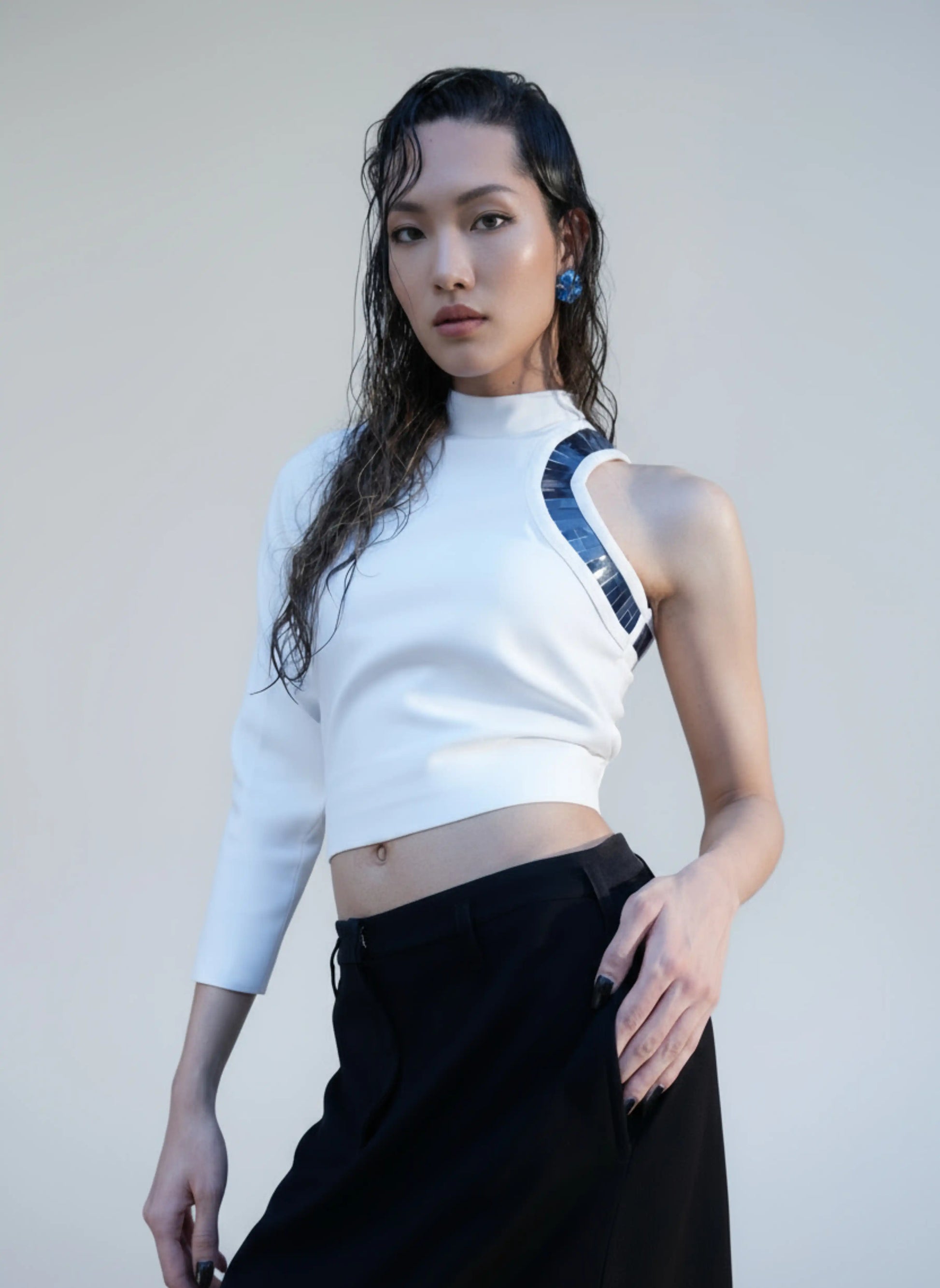Fusing modern minimalism with avant-garde detailing, this cropped top from Agahmi redefines statement wear. Designed with a fitted silhouette, the high-neck style exudes sleek sophistication. The standout feature is a single full-length sleeve, adorned with repurposed X-ray sheet embellishments, creating a unique texture and visual intrigue. Crafted from soft polyester, the back zip closure ensures a smooth fit, making this piece perfect for layering or wearing on its own.