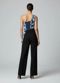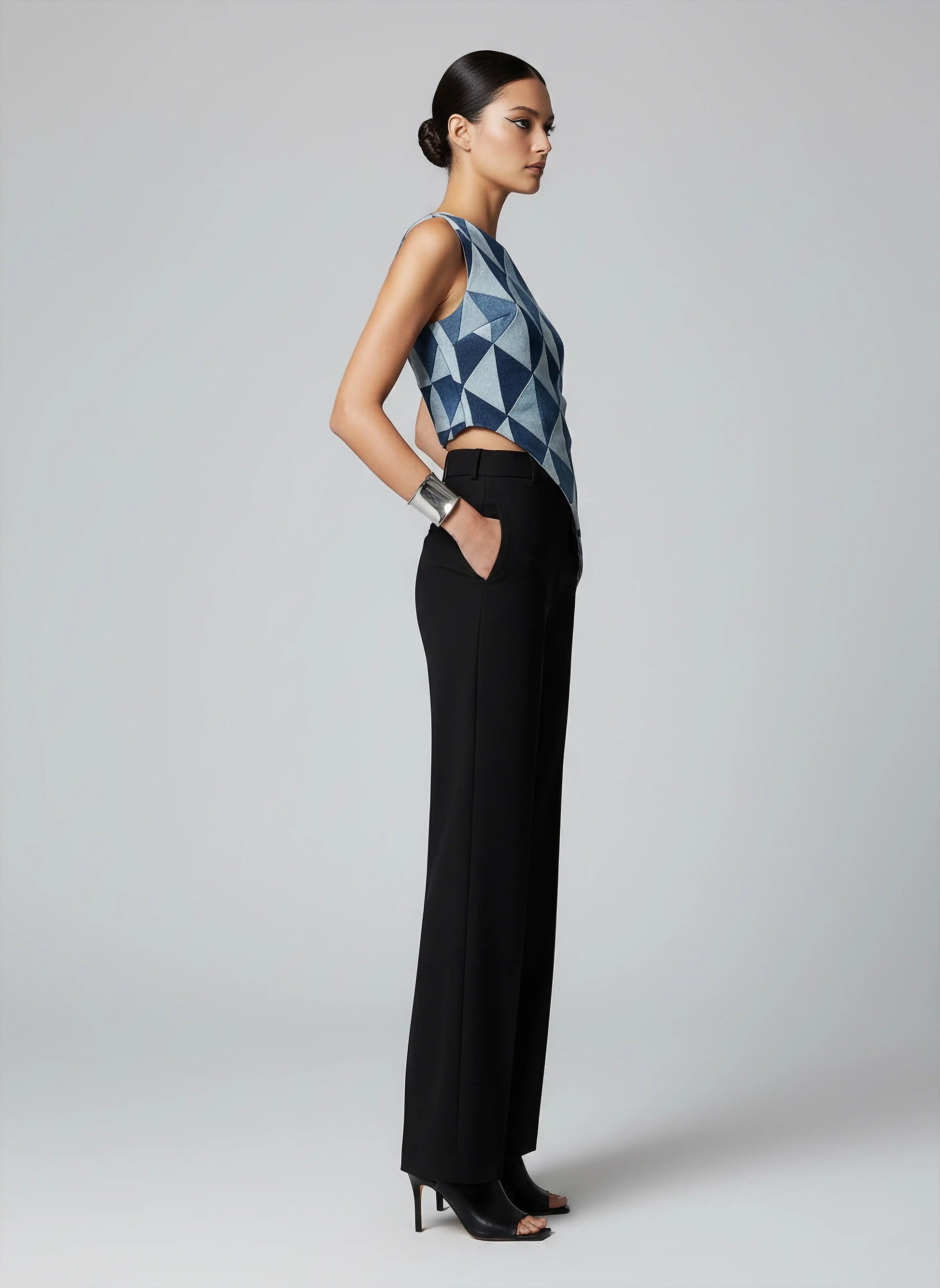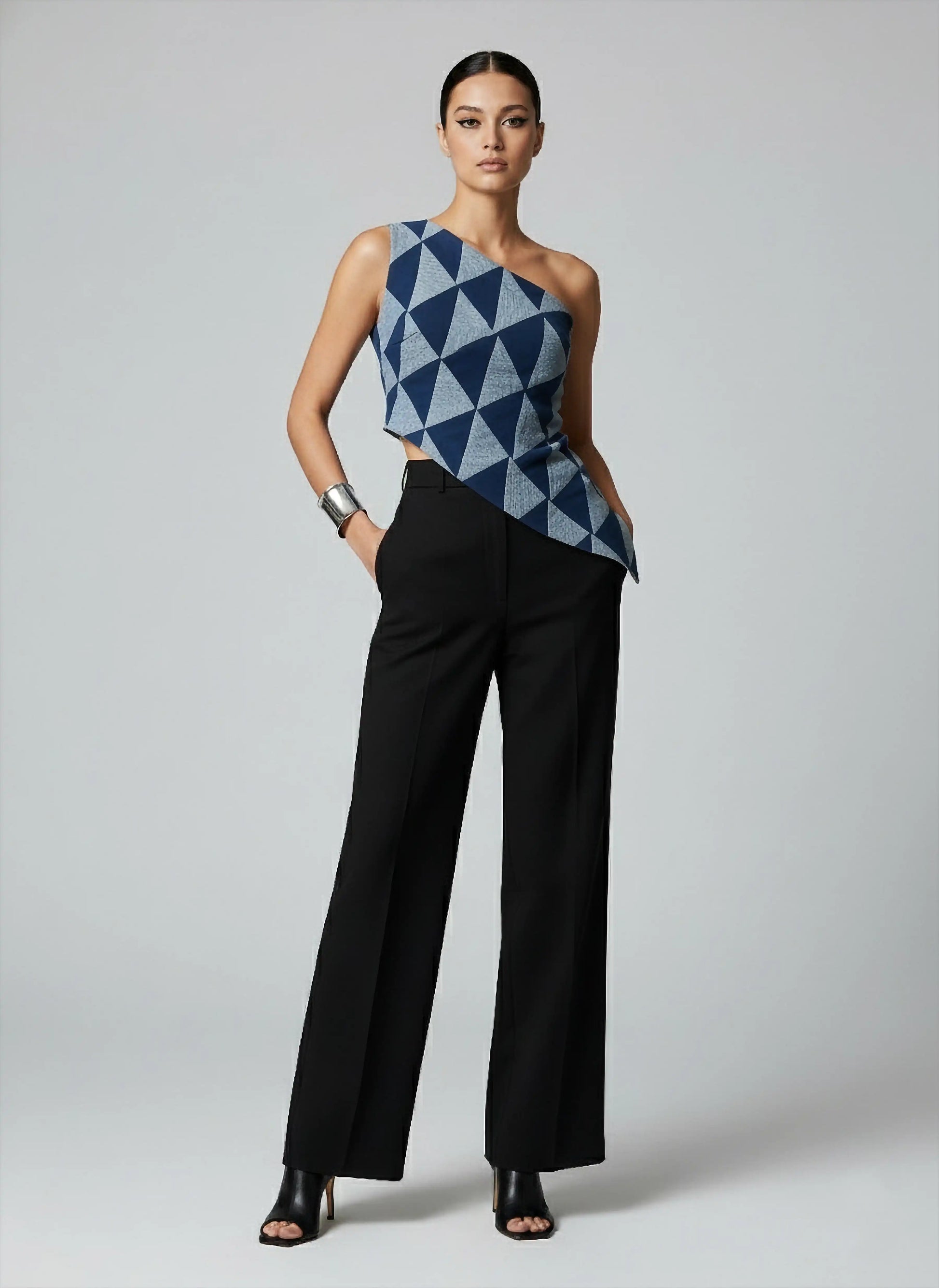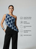 Designed with a one-shoulder neckline and asymmetrical hem, this top redefines modern denim. Two contrasting denim shades cut into triangular panels form an intricate geometric pattern, while a smocked back ensures a comfortable fit without compromising the sculpted silhouette. Contemporary, bold, and effortlessly chic—this piece brings an avant-garde twist to everyday dressing.